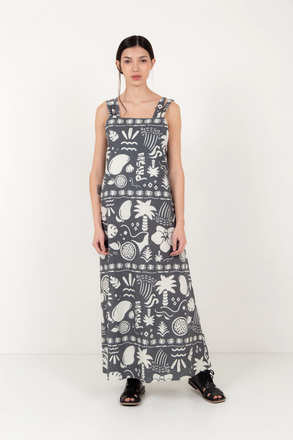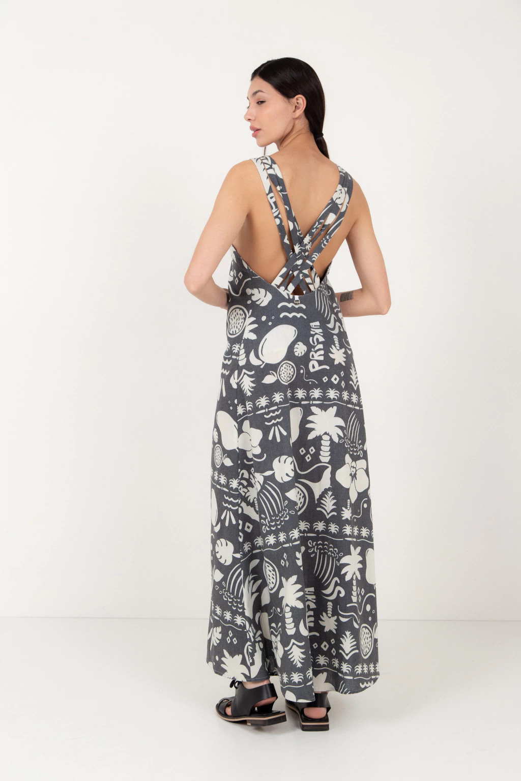 Un vestido unico, no solo por su estampa exclusiva sino por el diseño de su espalda. Es un modelo amplio de lino plano, con tiras en espalda que se cruzan y generan un detalle de frescura y originalidad que nos encanta.